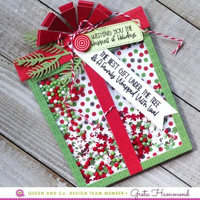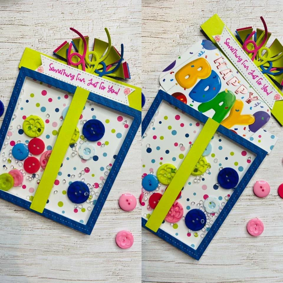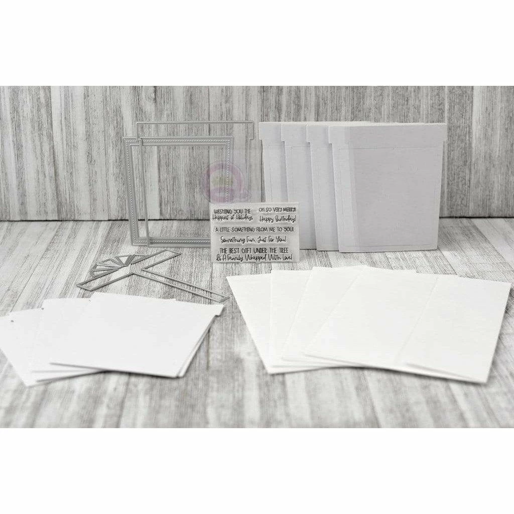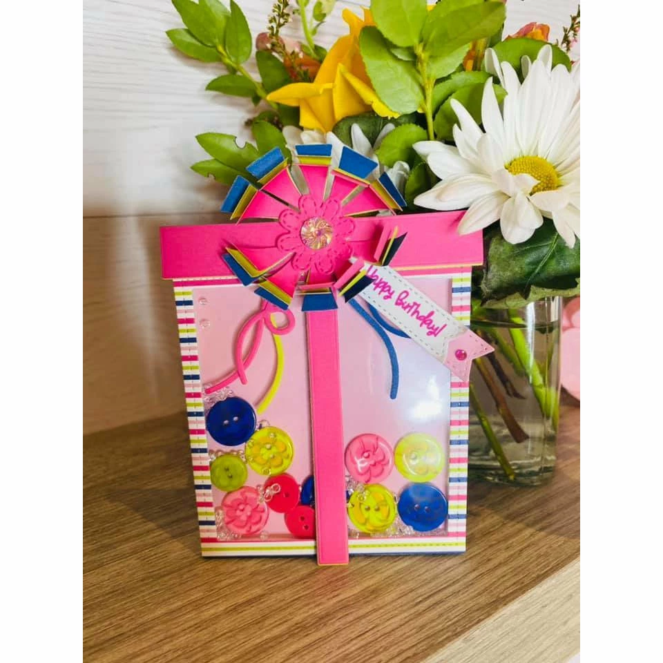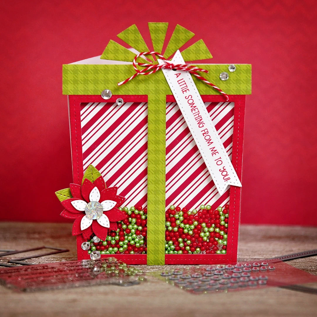 Includes 3 dies, stamps and 4 foam / acetate shaker shapes. Present measures 5.25″ x 4″. Outline dies is included.