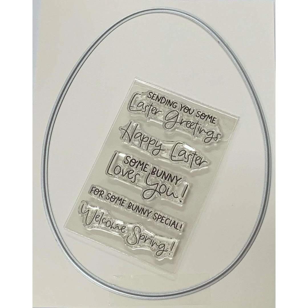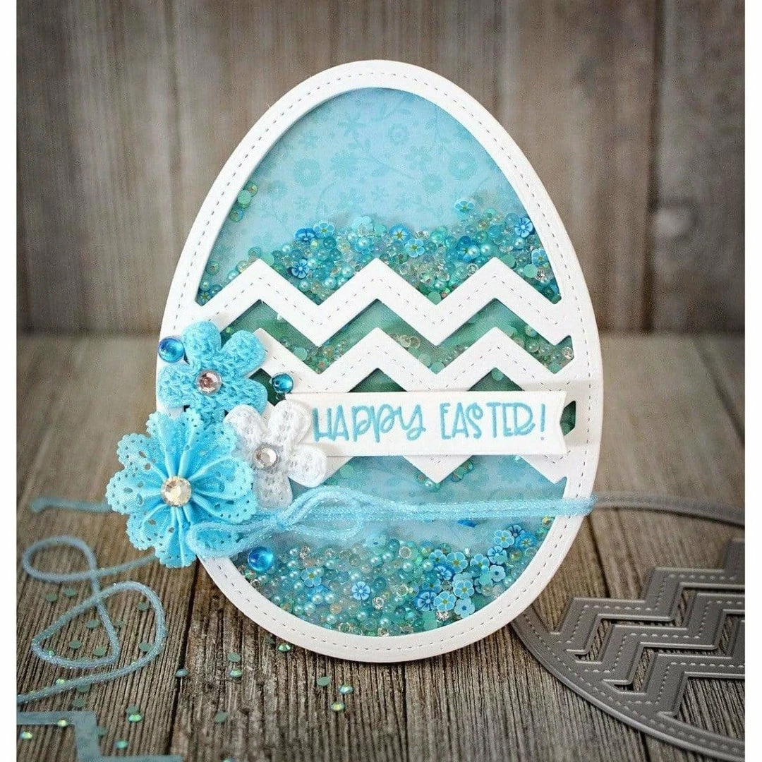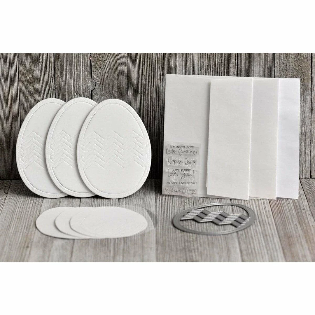 This adorable Easter Egg kit includes 1 Easter Egg Shaped Card Die, 1 Easter Egg Outline Die, 4 foam/acetate shakers and 2×3 clear stamp set. Creates finished card sized at 4″ x 5.25″. Toppings and embellishments in samples are sold separately.