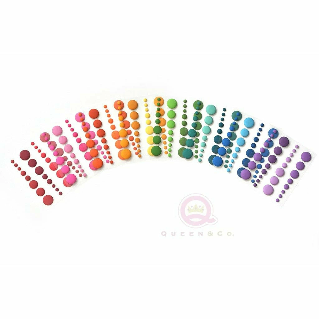 Includes 9 packages of glitter epoxy dots. 32 pieces per color in varied sizes.