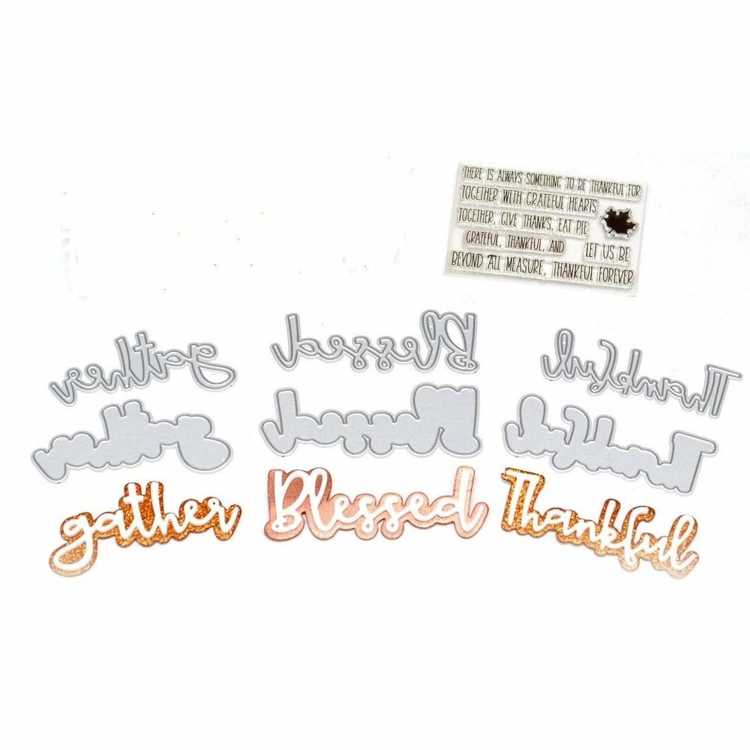 Set includes 3 word dies, 3 word outline dies, 2×3 stamp set. This set has been updated in 2020 to no longer include glue sheet and foils.