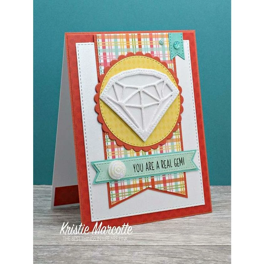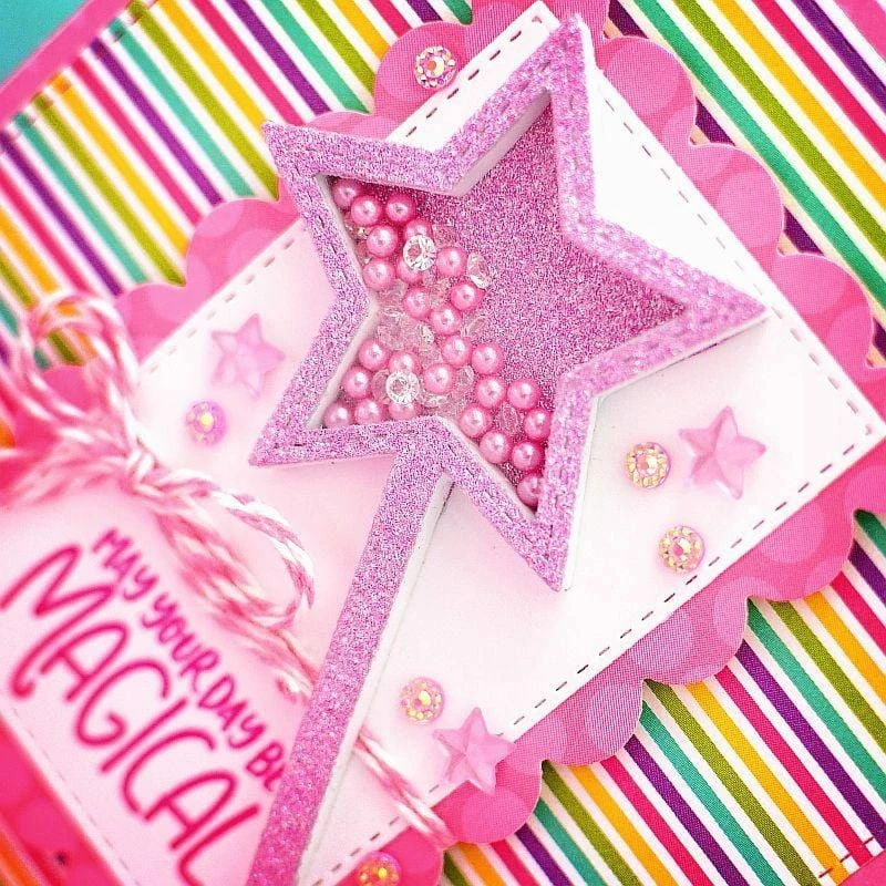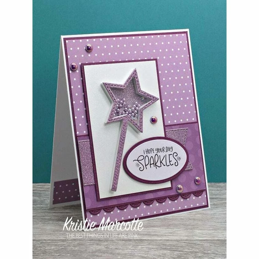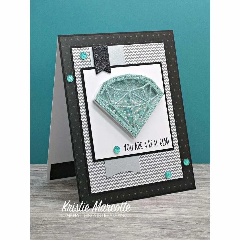 This shaped shaker kit includes 3 dies and 9 coordinating foam/acetate shakers plus 3×4 stamp set (made in USA).