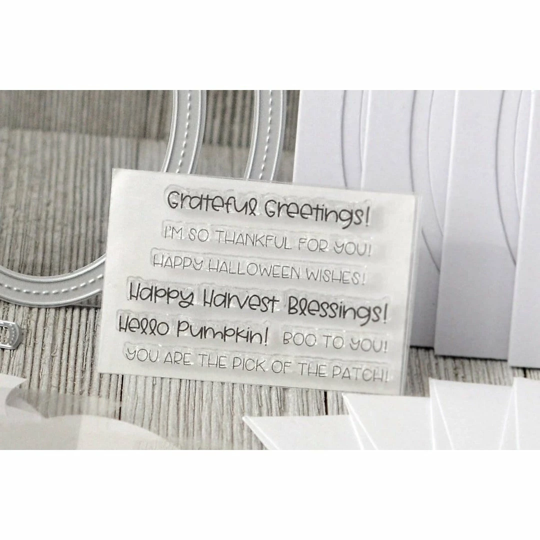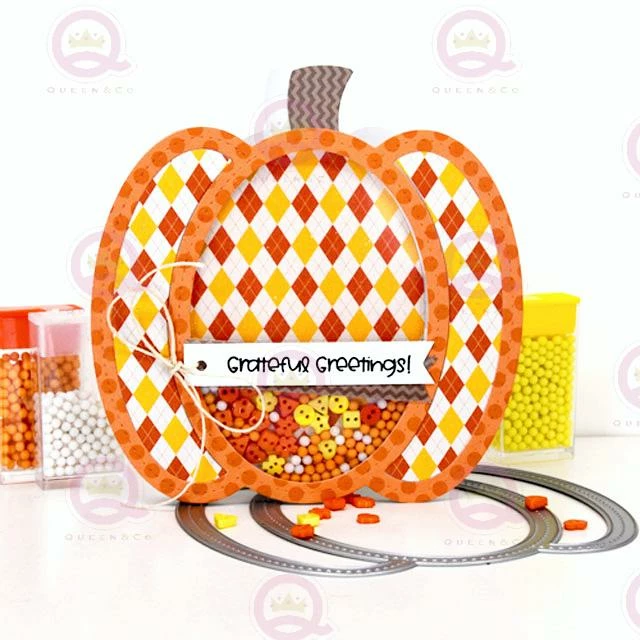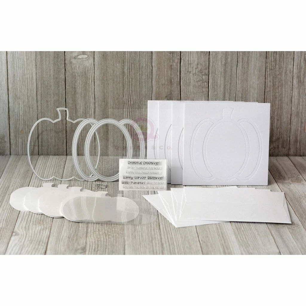 Includes Pumpin shaker die, Pumpkin outline die, 2×3 stamp set, 4 foam/acetate shakers, 4 shaped cardstock bases. Die measures approximately 4.75×4. Does not include envelopes.