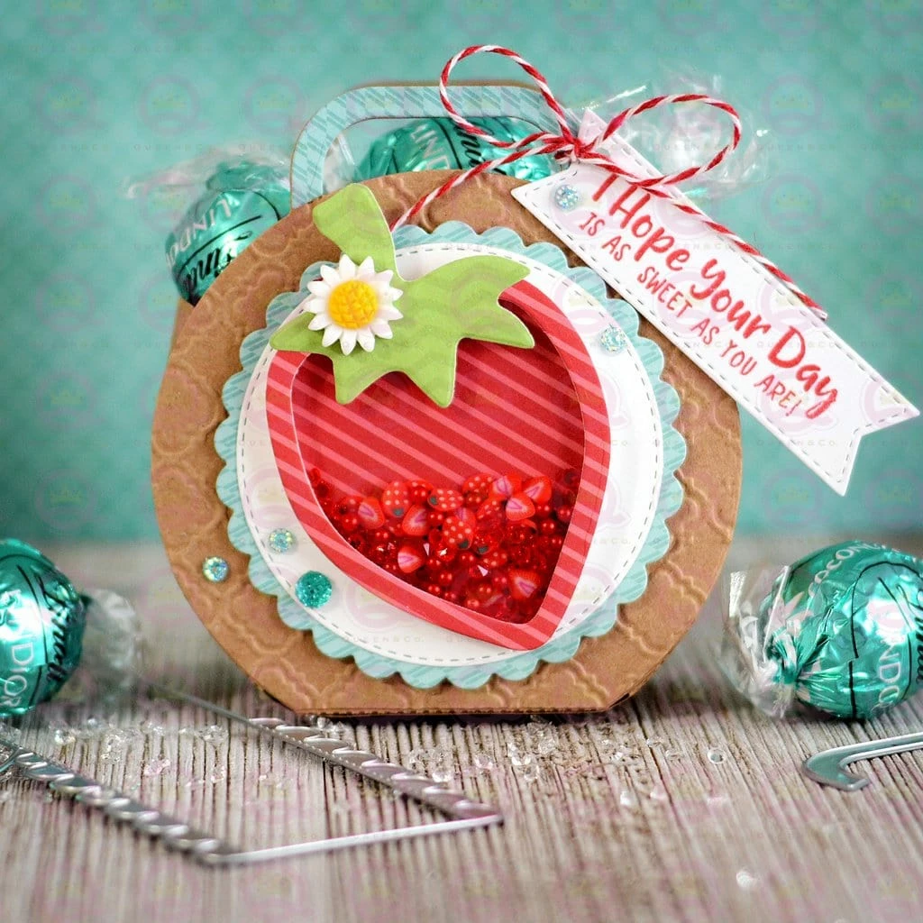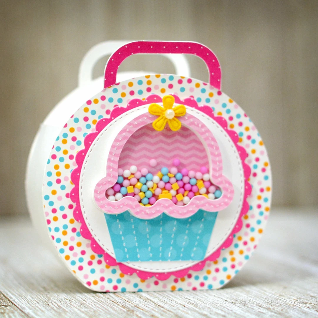 Three die set designed to create adorable round treat box holder. Designed to hold most of our shaker shapes on the front of the box. Box measures 3.75 x 3.75 x 1.5″ deep.