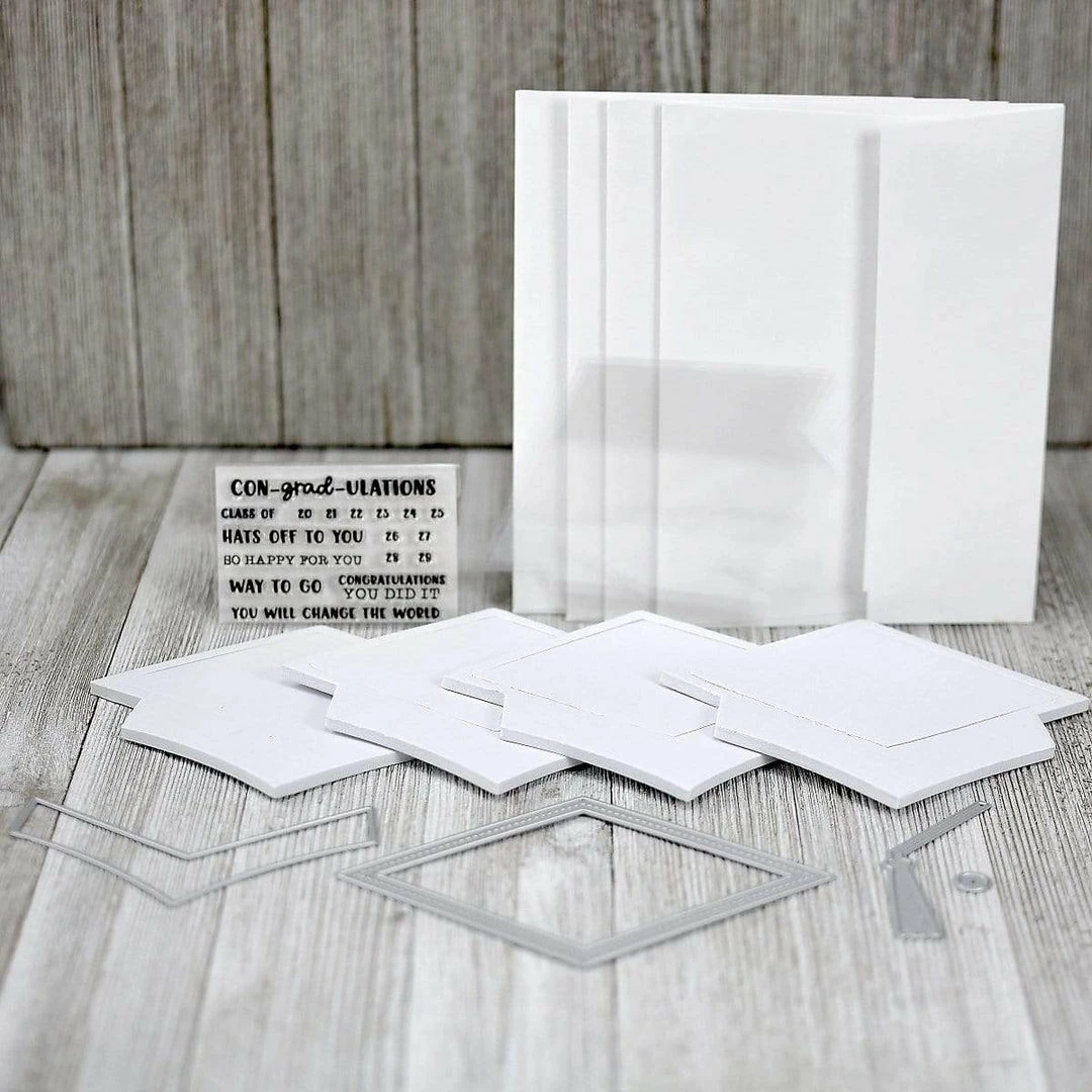 Includes dies, 4 foam / acetate shakers, and 2×3 stamps. Outline die will be available early June.