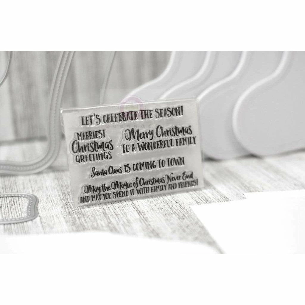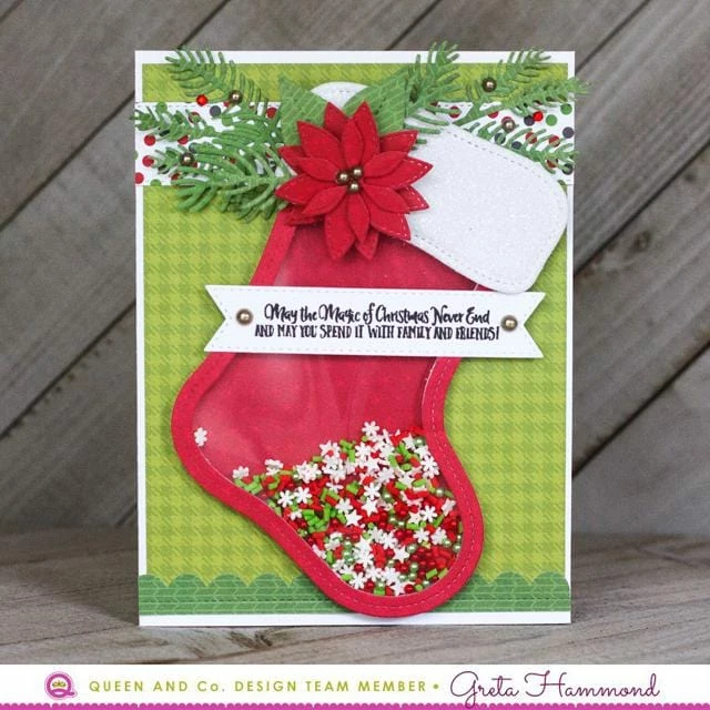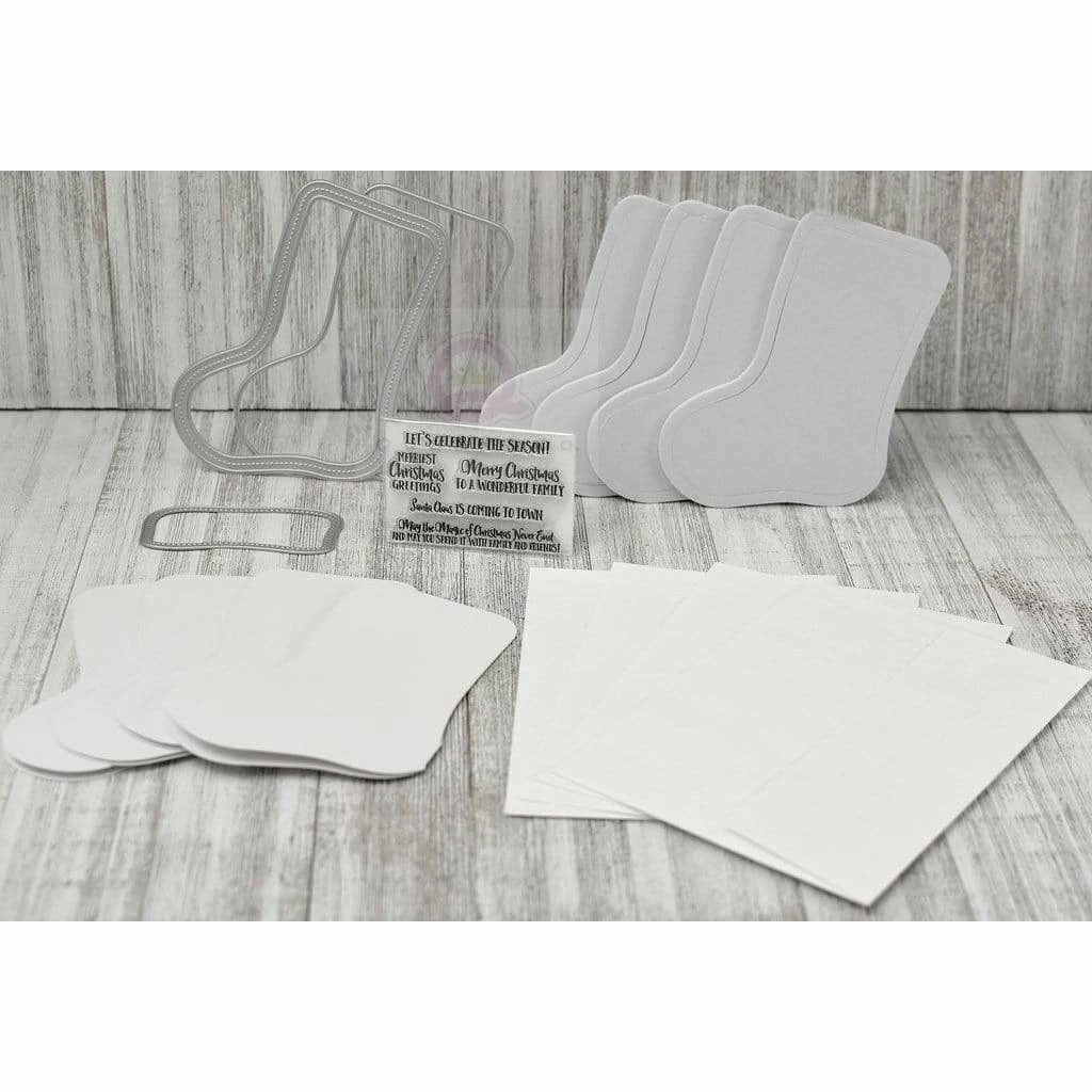 Includes 3 dies, stamps and 4 foam / acetate shaker shapes. Stocking measures 3.75″ x 5.25″. Outline dies is included.