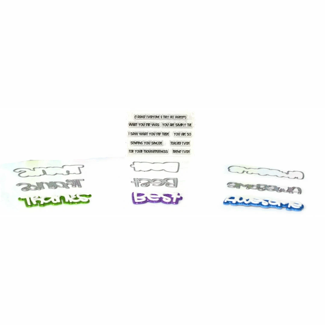Includes 3 word dies, 3 outline dies. Please note: the outline and word dies are nested together for packaging purposes.
