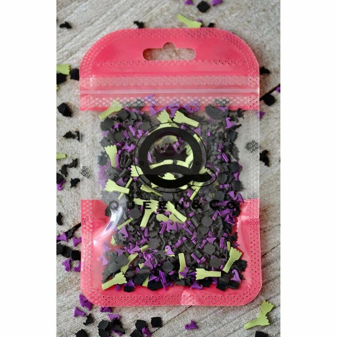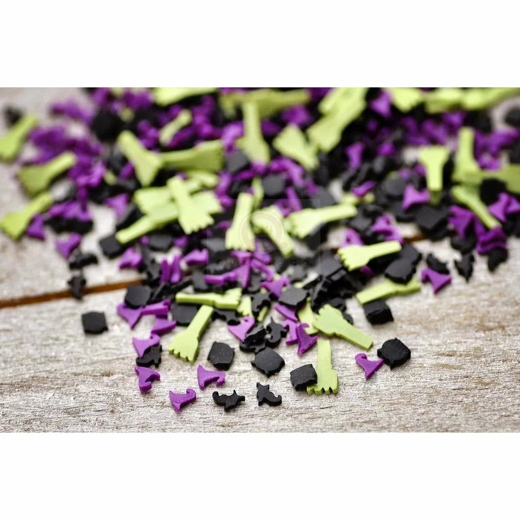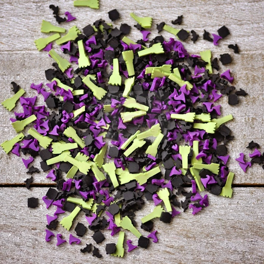 Includes mixture of witch hat, witch shoe, cauldron and broom. Mix packaged inside 2×3 zip bag.